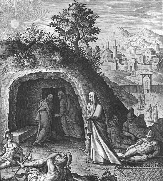 No primeiro dia da semana, Maria Madalena foi ao túmulo logo de manhã, ainda escuro, e viu retirada a pedra que o tapava.